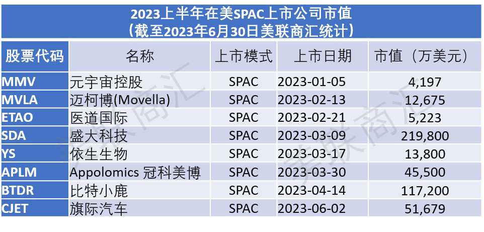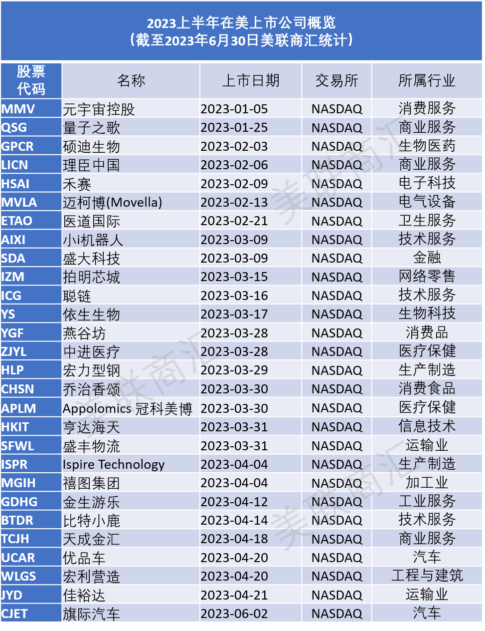 2023年中概企业赴美上市,随着中美审计合作协议落地以及境外上市新规出炉逐渐释放,截至6月30日,2023年上半年共有28家中概企业在美国上市。同比2022年上半年6家中概企业上市,数量增长360%。28家上市中概企业中,有8家通过SPAC上市,并且我们发现,通过SPAC上市的企业在上市后市值规模上,远超IPO上市企业。越来越多的优质中概企业选择通过SPAC稳步上市。虽然国际形势复杂,但是国际经济合作依旧向前、动态发展。美联商汇将从上市数量、募资额、市值规模、行业分布情况等维度展开分析,与大家交流。